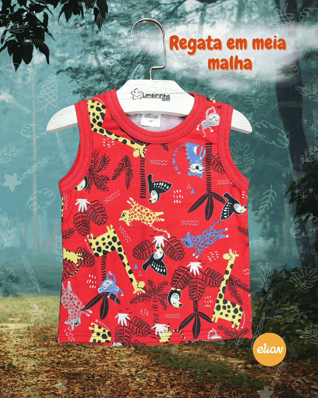 Regata em meia malha vermelha com estampa lúdica de animais do safari. 🐆
