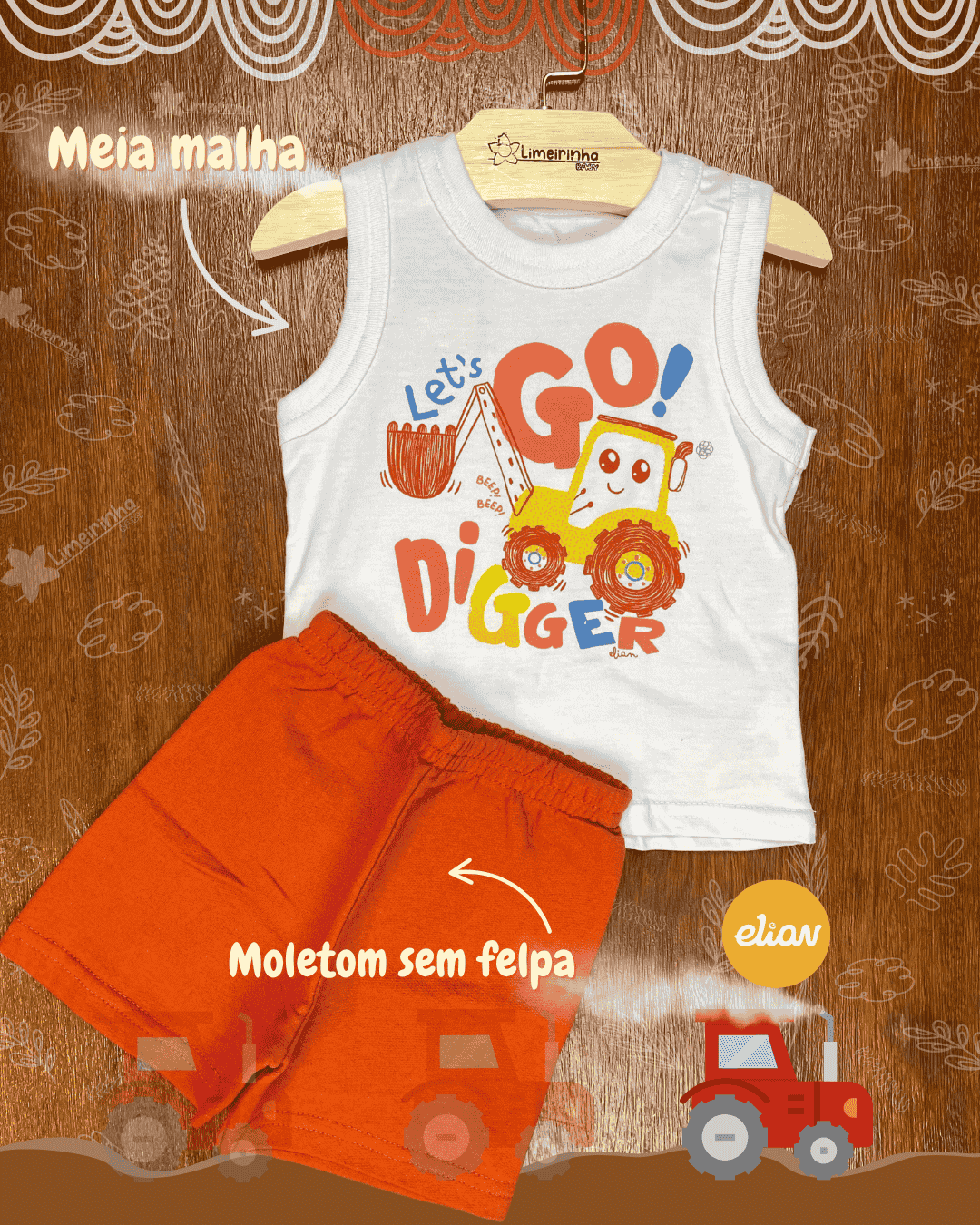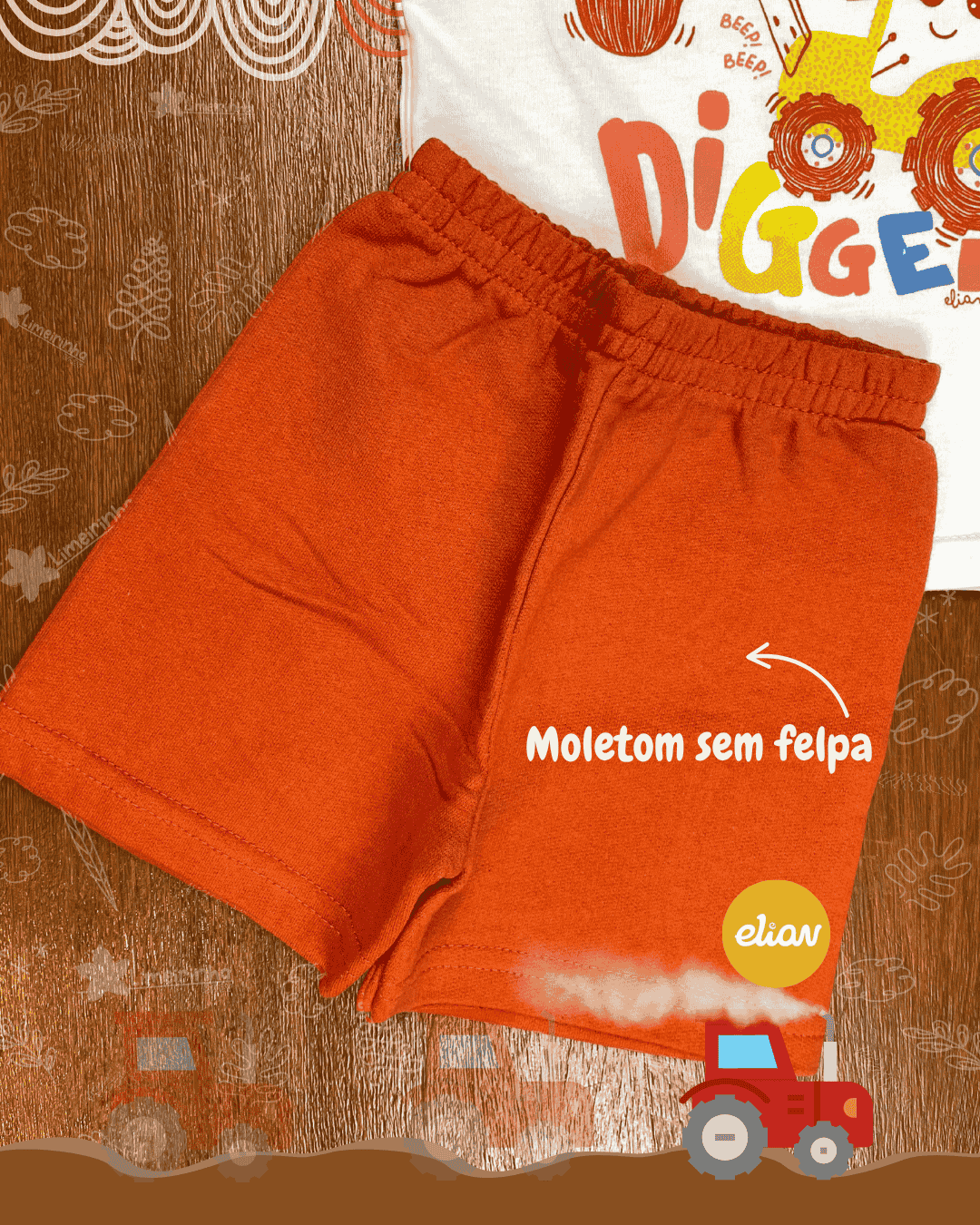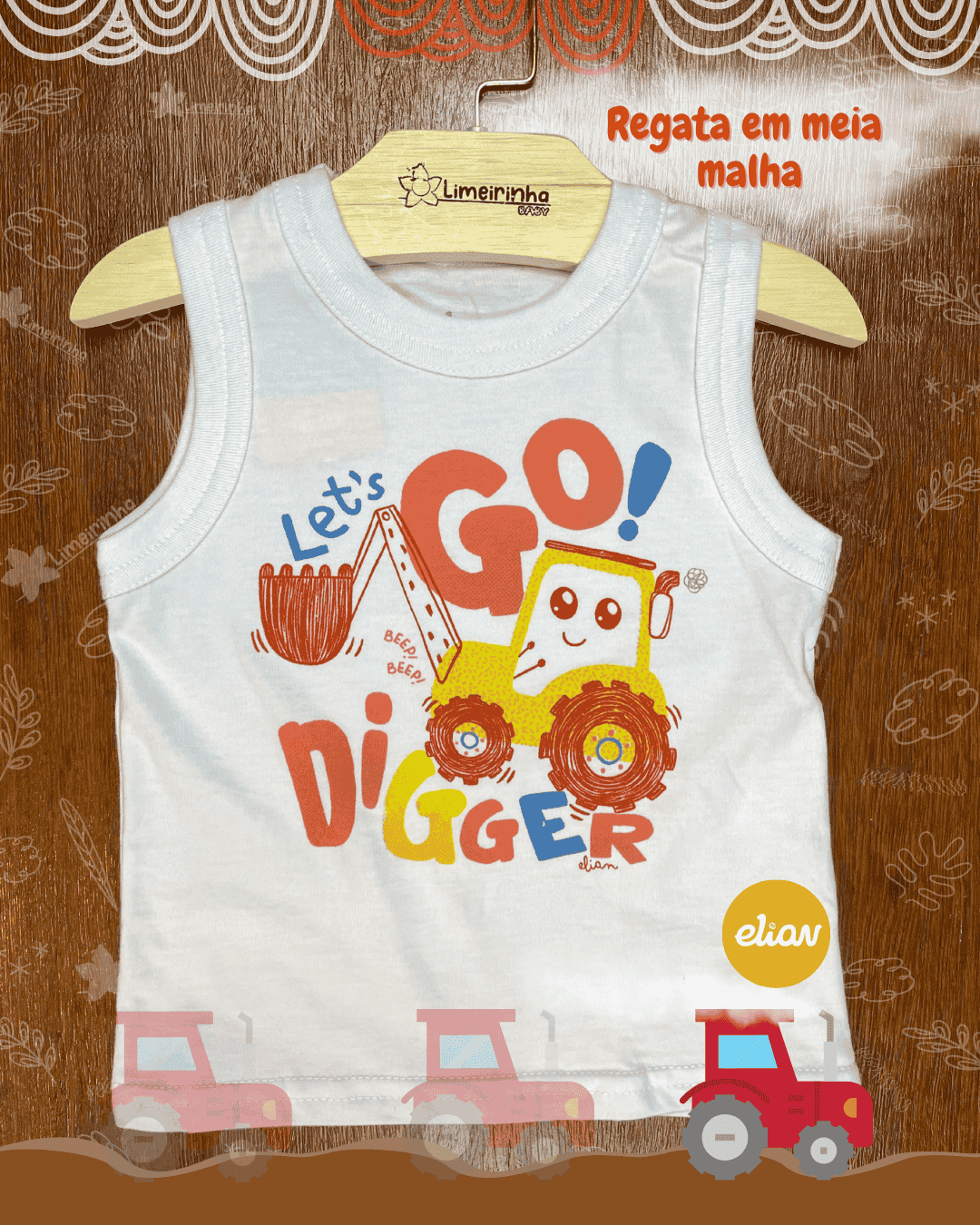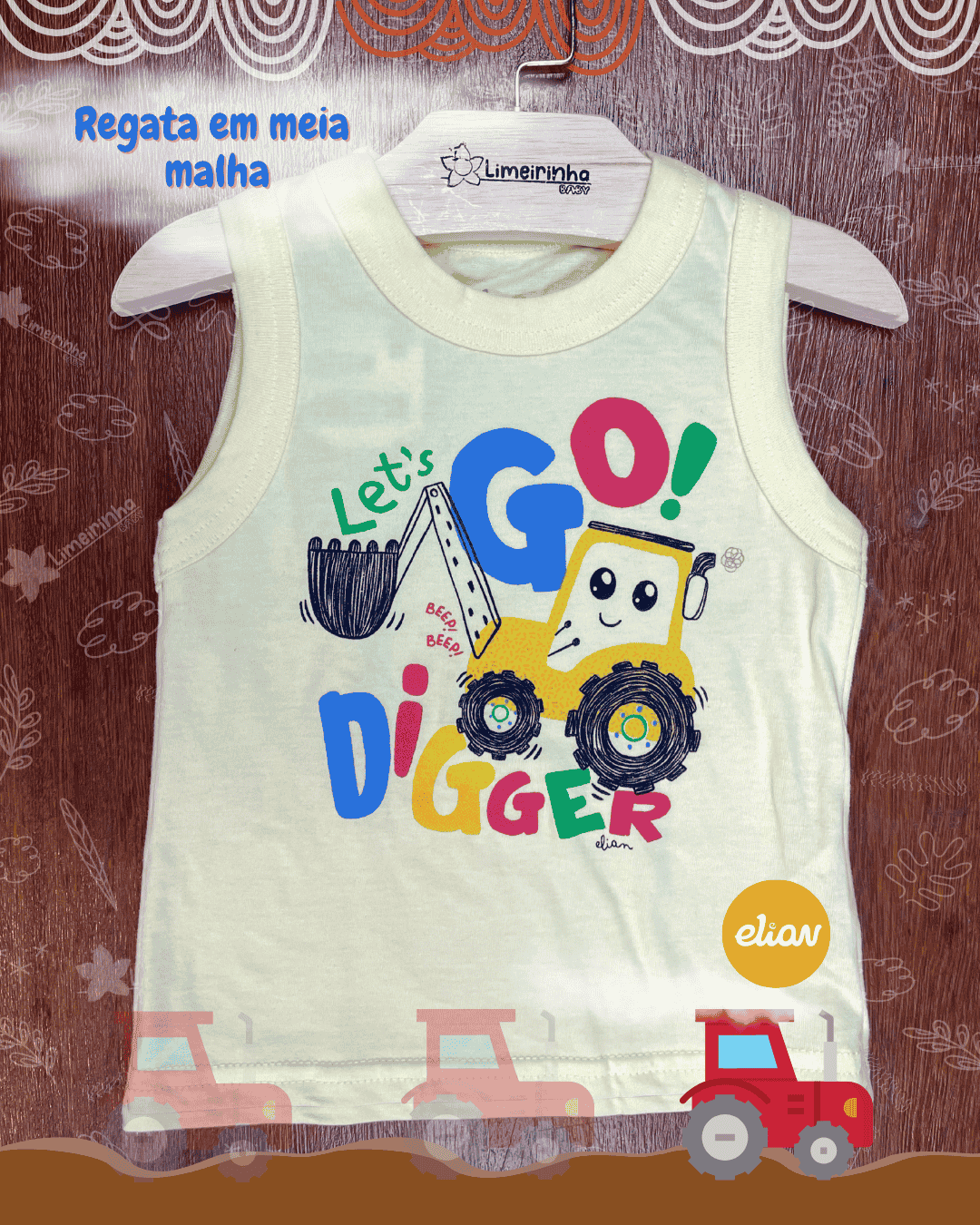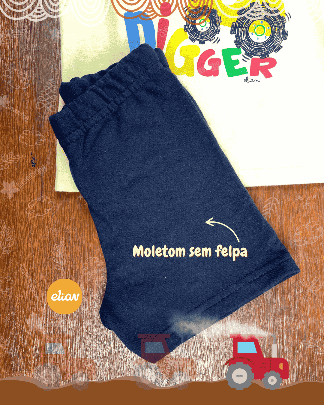 Regata em meia malha com estampas lĂșdicas de trator e animais do safari.