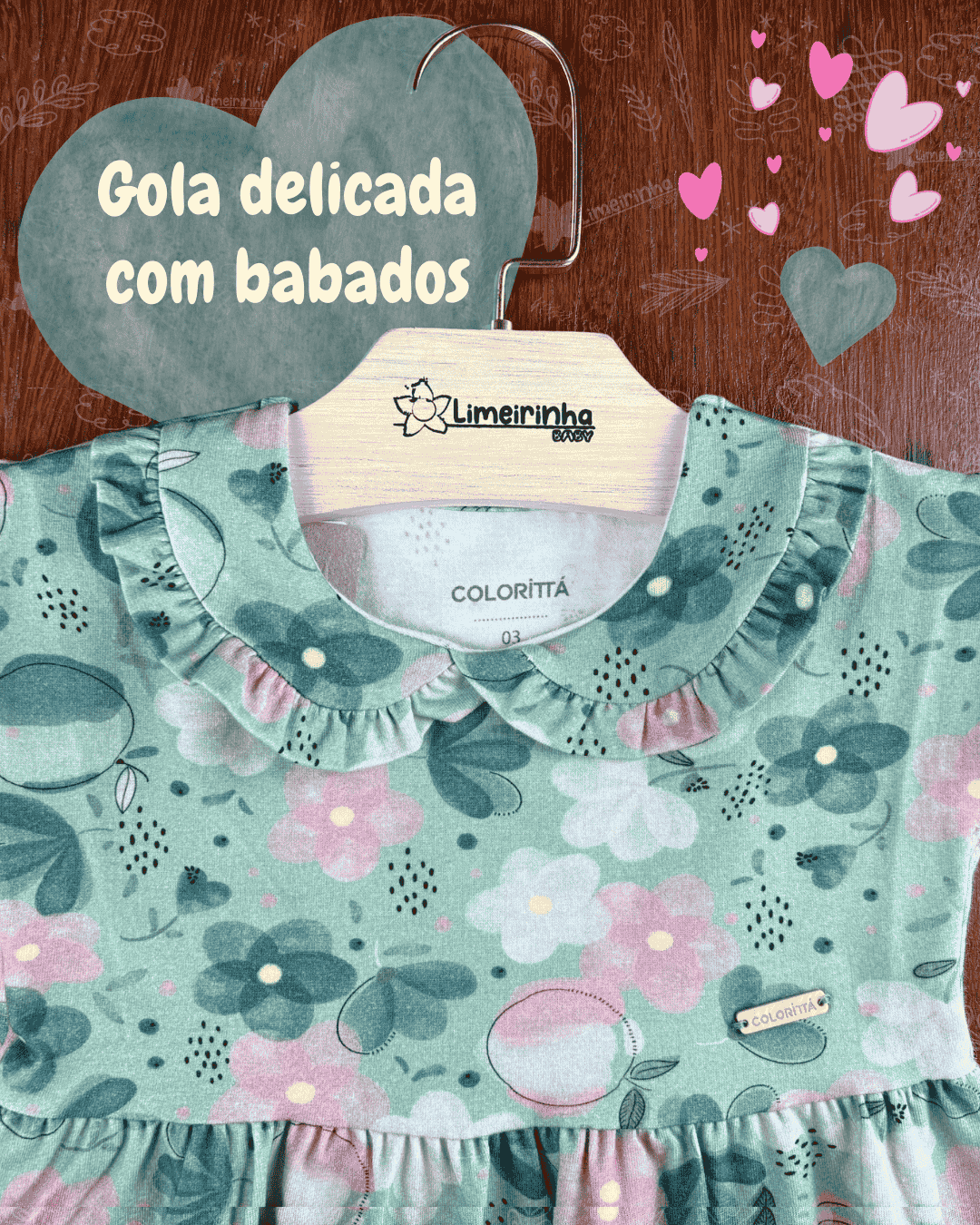 Detalhe encantador na gola boneca com babados. Uma fofura.🌼