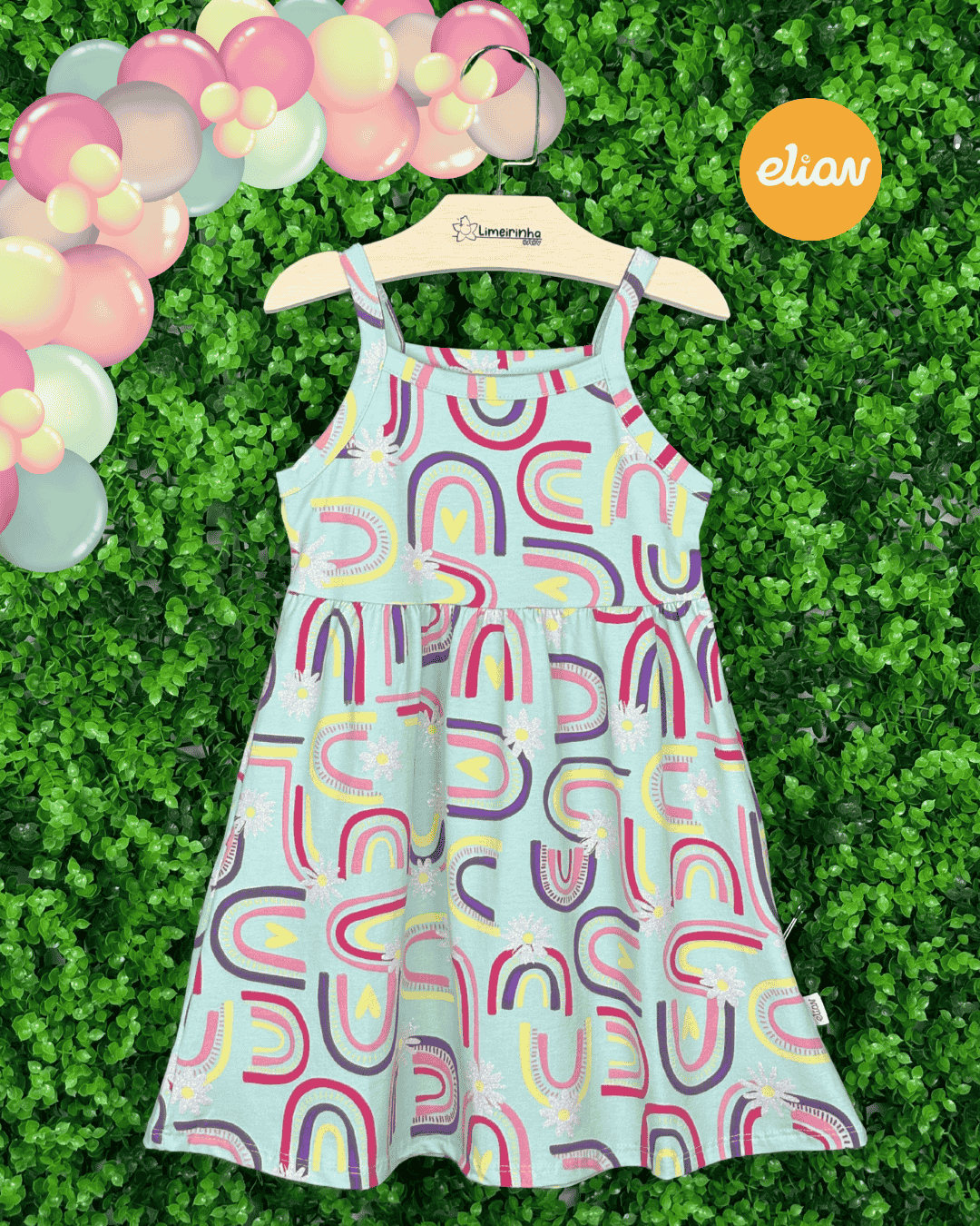 Vestido Elian Arco-Íris e flores com glitter regata é confeccionado em meia malha. 😍