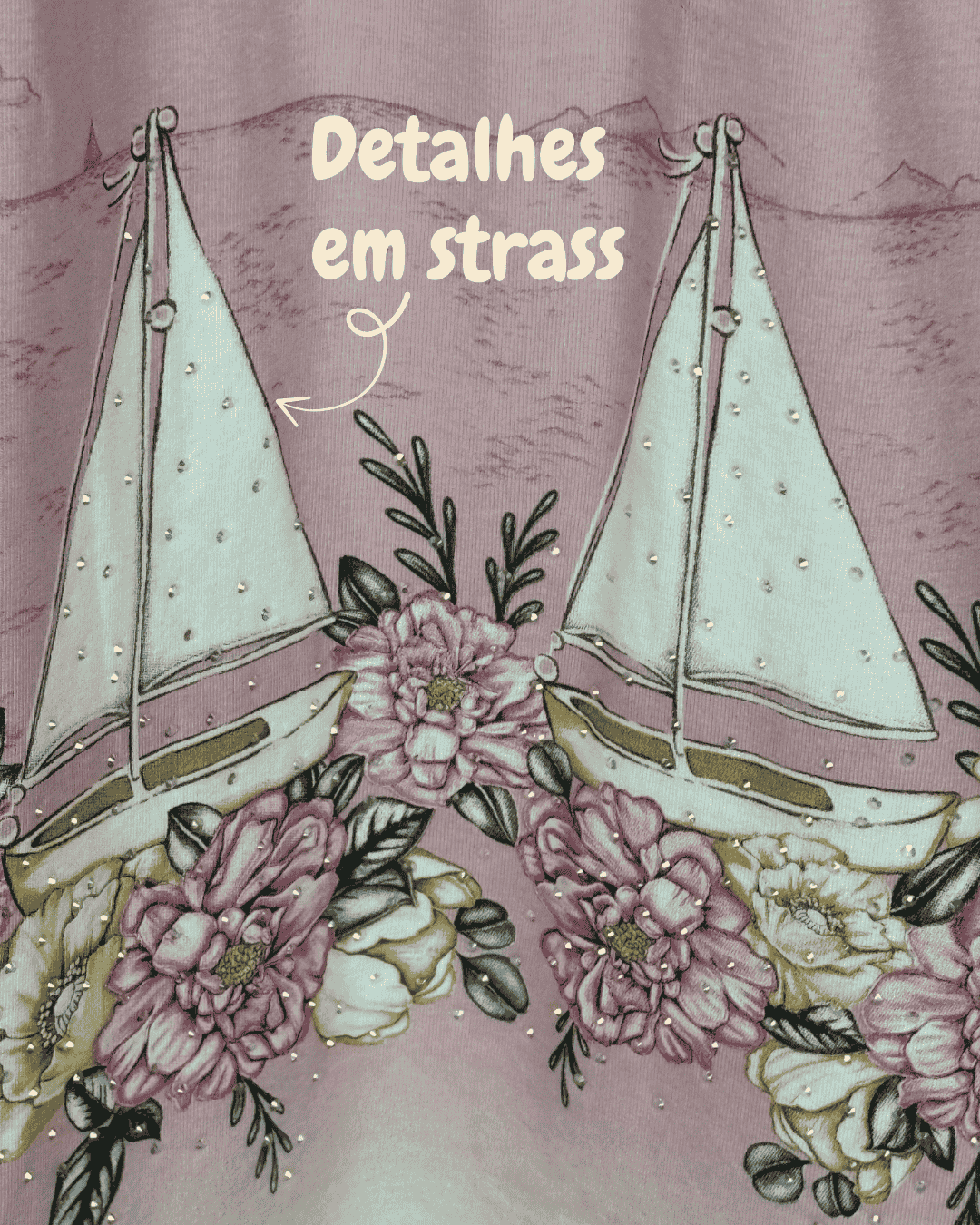 Estampa de barcos e flores com detalhes em strass na estampa.